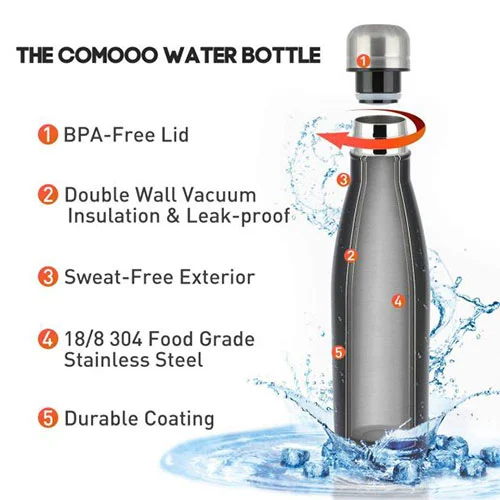 Cola pudel on valmistatud roostevabast terasest, see on topelt sein, sisemine on 18/8 roostevabast terasest, välimine osa on 18/0 roostevabast terasest. Kaaned on PP -materjal, toiduklass. Pind on pihustusvärvi viimistletud, muidugi saame teie nõudmisena teha mõne teise tehnoloogiaga. Seal on 4 võimsust, see sobib erinevale keskkonnale. Ja pudel on vaakum isoleeritud, võib kohvi hoiatada 24 tundi ja külmemat 32 tundi.