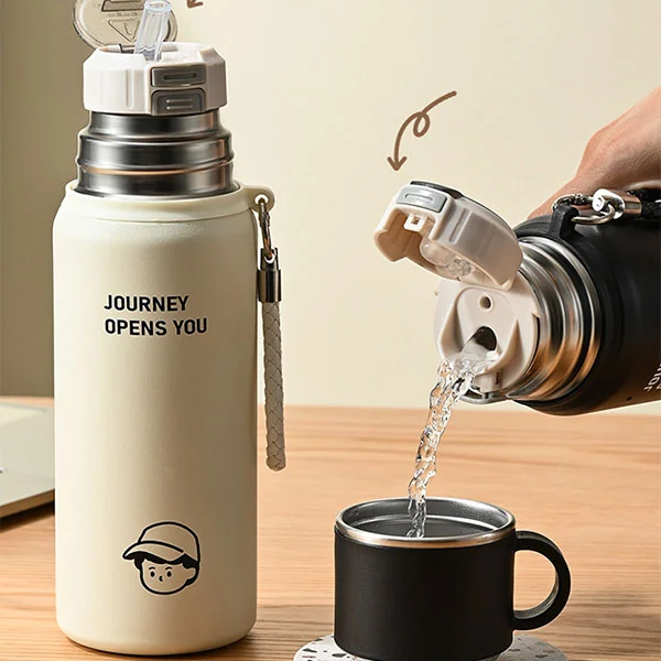 Kaane osa: PP kaas pluss roostevabast terasest kaas. Roostevabast terasest kaane ülemist osa saab kasutada üksi väikese tassina. Pitseeritud kaane sektsioon on topelt joodav kaas. Ühe lüliti saab vajutada, et see avada otsese joomise jaoks, võimaldades vett siseneda väikesesse tassi samal ajal. Teine nupp saab õlgede joogivälja õlgede kaudu avada õlgede.